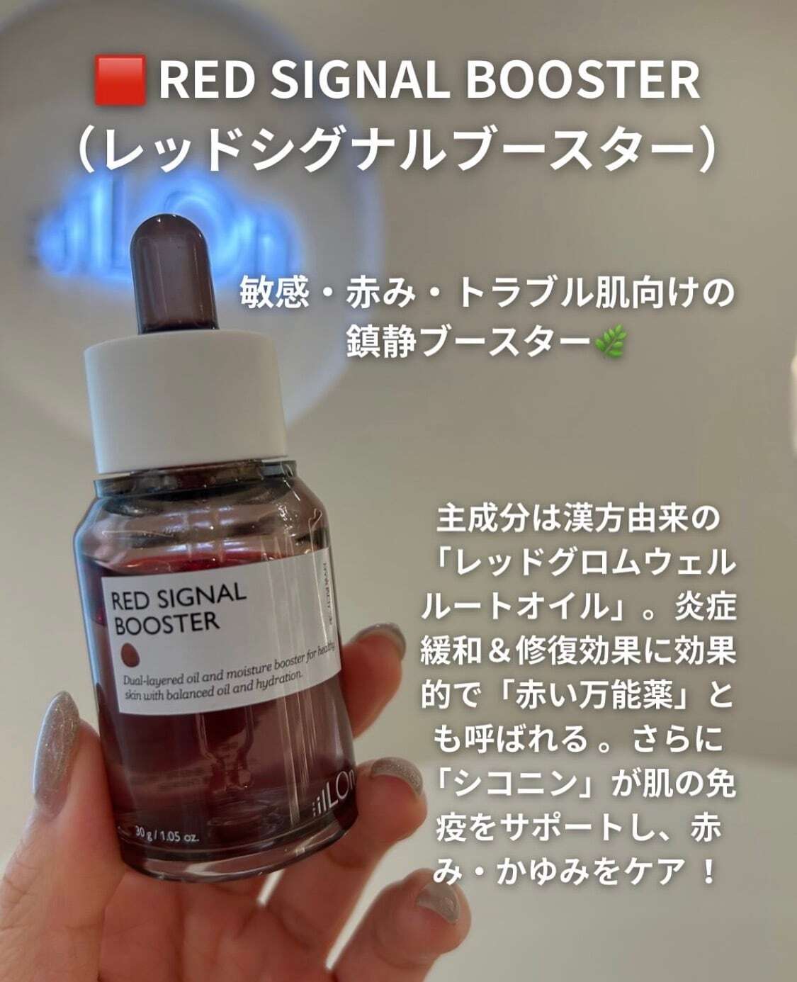 肌の赤みやトラブルに悩む方へ。「RED SIGNAL BOOSTER(レッドシグナルブースター)」は、韓国コスメブランドILLON(イロン)が開発した、敏感肌向けのアンプルブースターです。古来より傷の治療に使われてきたレッドグロムウェルルートオイルを配合し、肌のバリア機能を強化しながら、鎮静と回復をサポート。外部刺激に敏感な肌にもやさしく働きかけ、赤みを抑えて健やかな肌へと導きます。